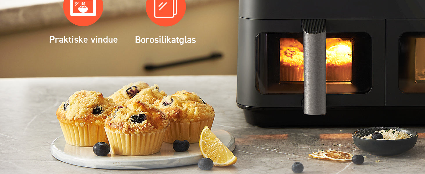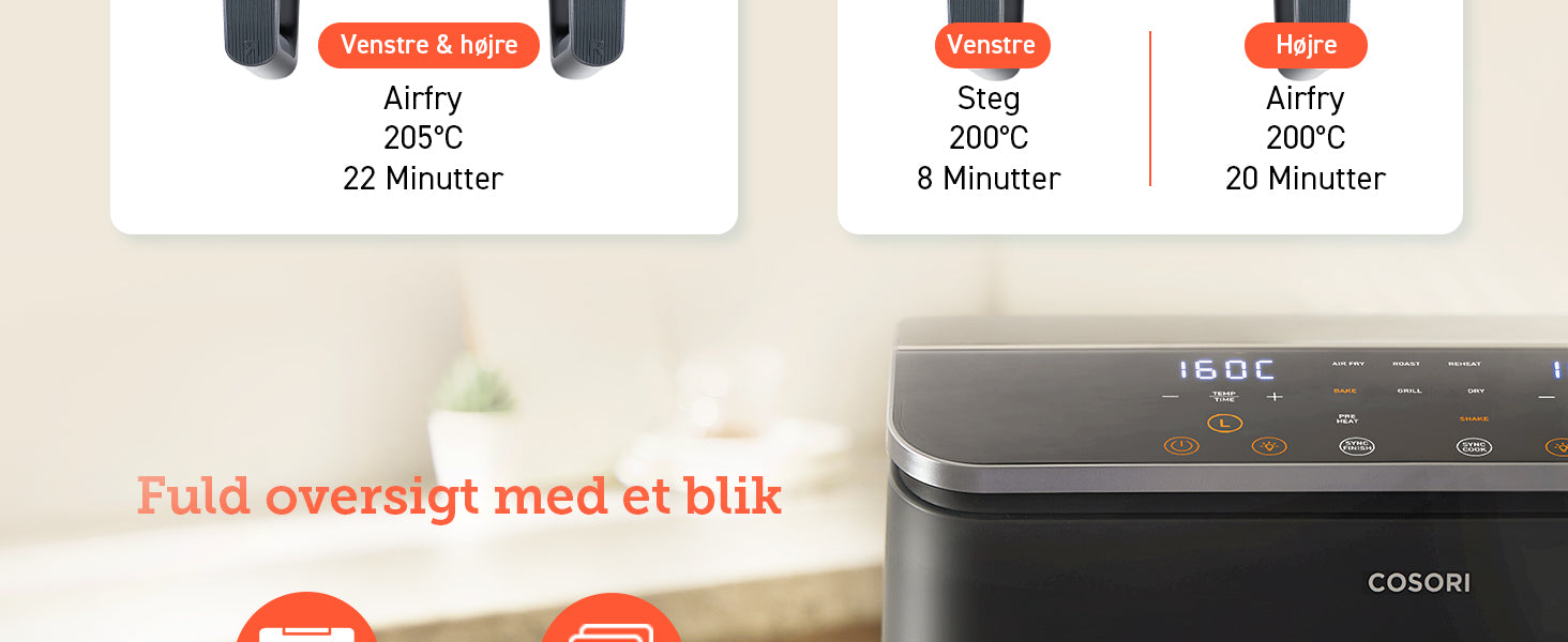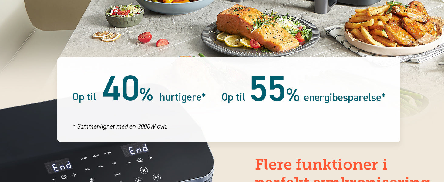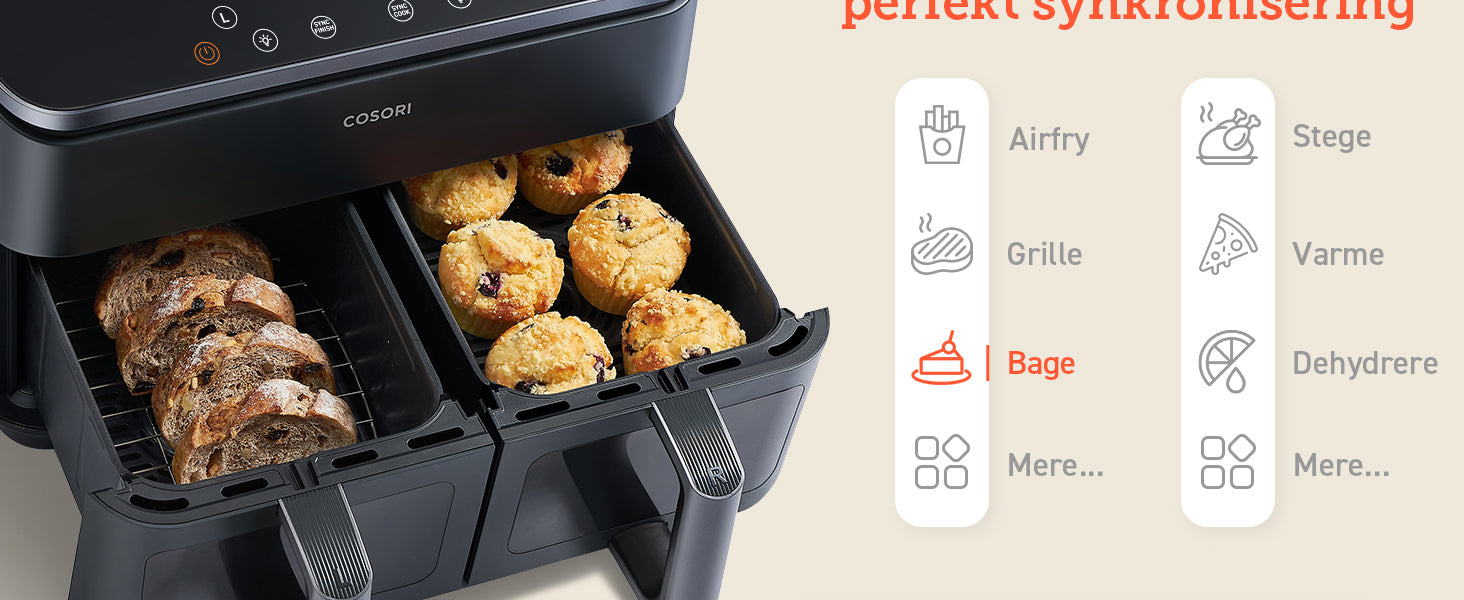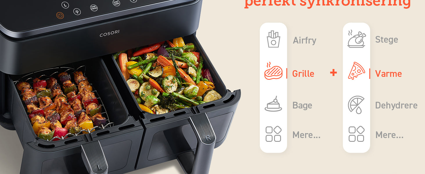 Airfry, steg, varm op, bag, grill, tør, Sync Cook, og Sync Finish. Tilbered dine yndlingsmåltider med et enkelt tryk, uden besvær.