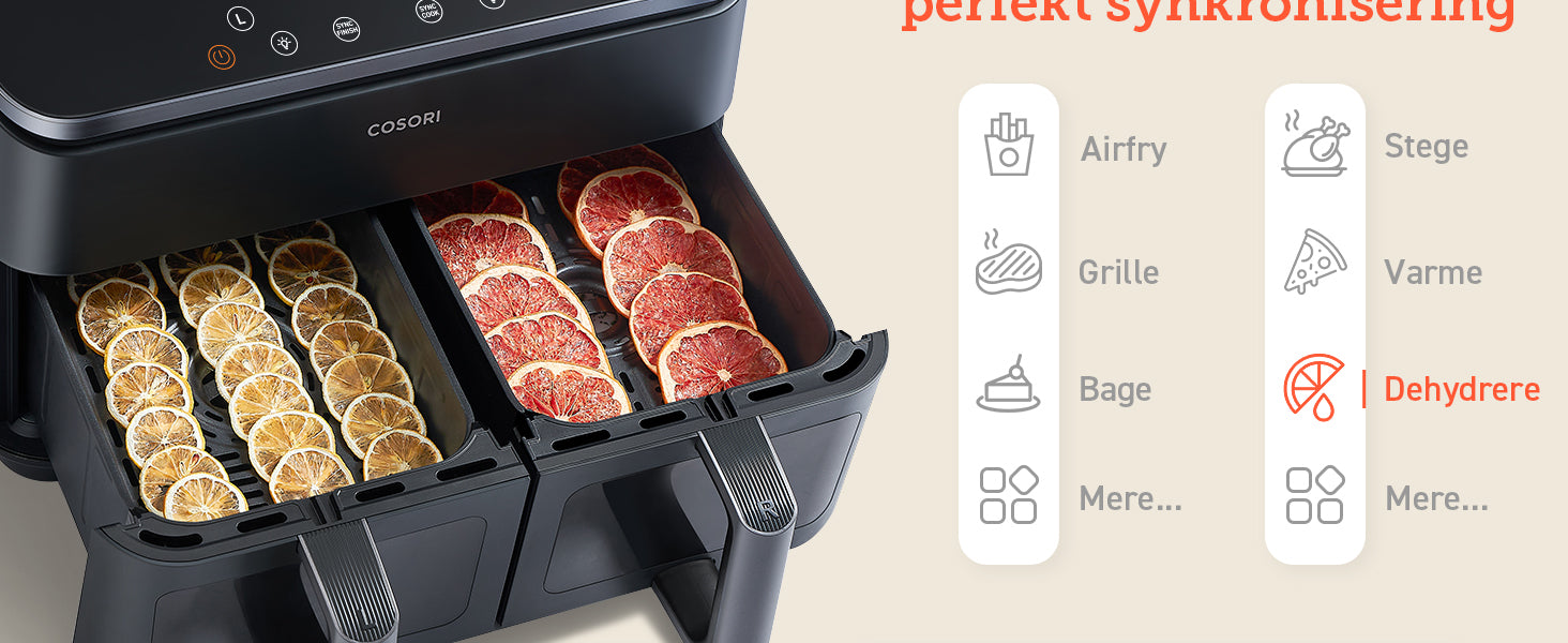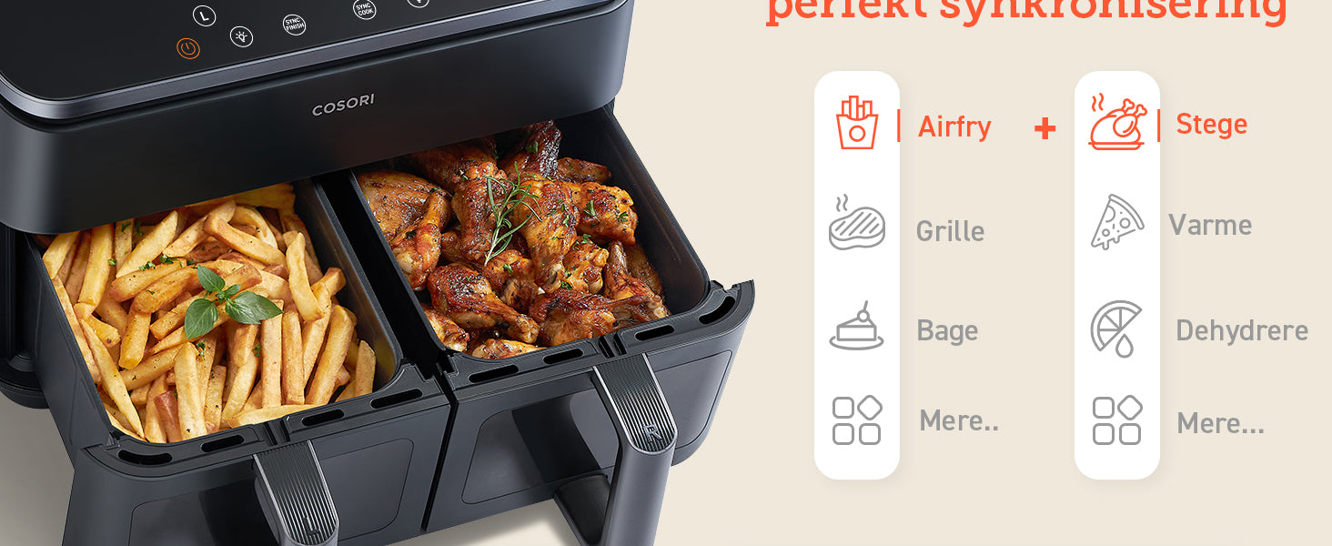 Oplev nem madlavning med COSORIs innovative dobbeltkurv-design, som gør det muligt at tilberede et komplet måltid på en effektiv og tidsbesparende måde. Med to separate kurve er det som at have to airfryere i én, hvilket giver dig en strømlinet madlavningsproces.