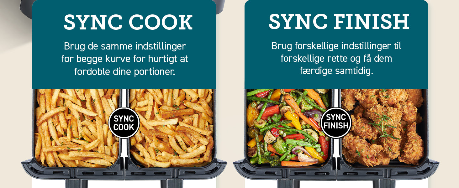 Sync Cook: Brug de samme indstillinger for begge kurve for hurtigt at fordoble portionerne. Sync Finish: Brug forskellige indstillinger til forskellige retter og få dem færdige samtidig.