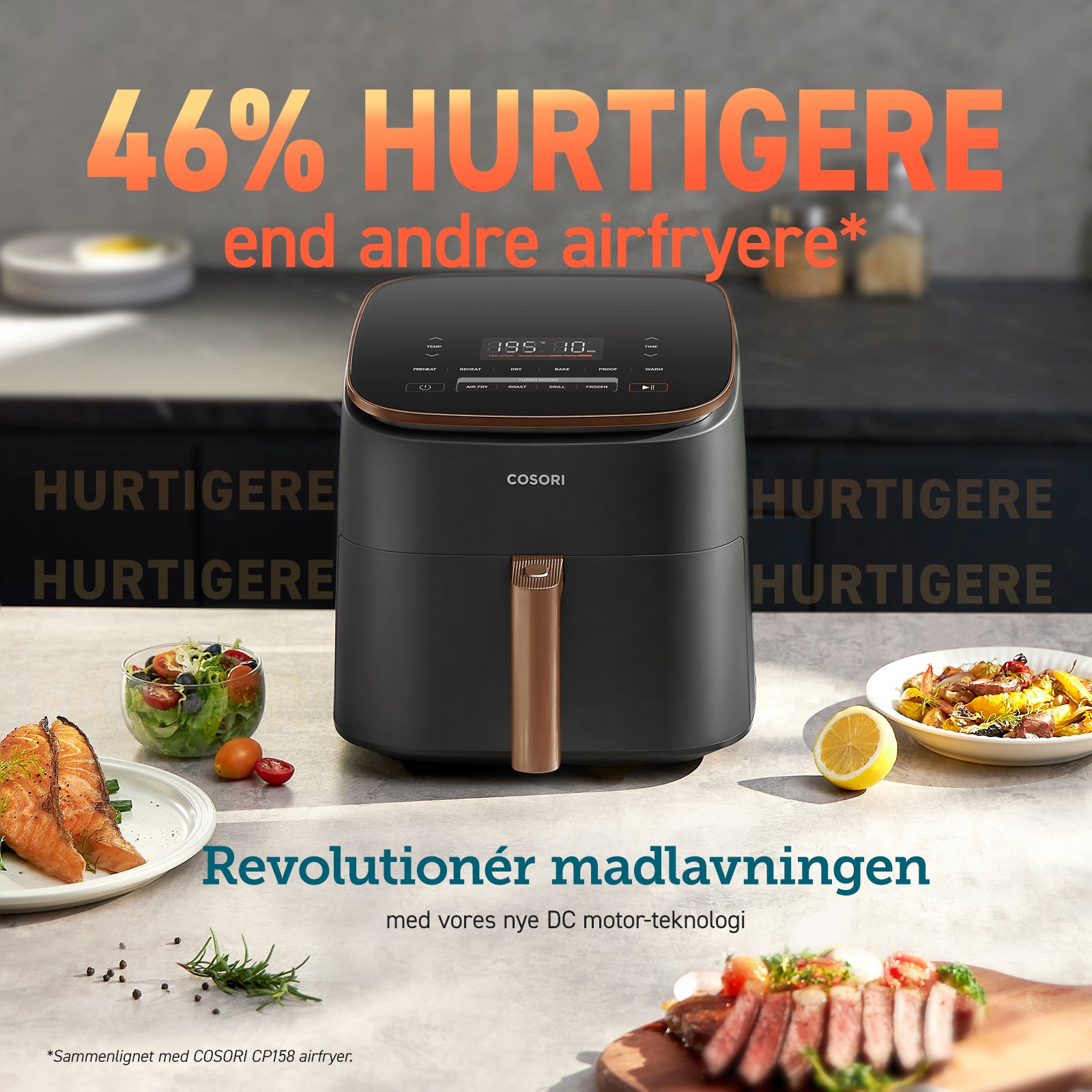 Sammenlignet med andre COSORI airfryers laver denne model mad op til 46 % hurtigere takket være DC-motorteknologien, hvilket frigør dig fra tidskrævende madlavningsmetoder.