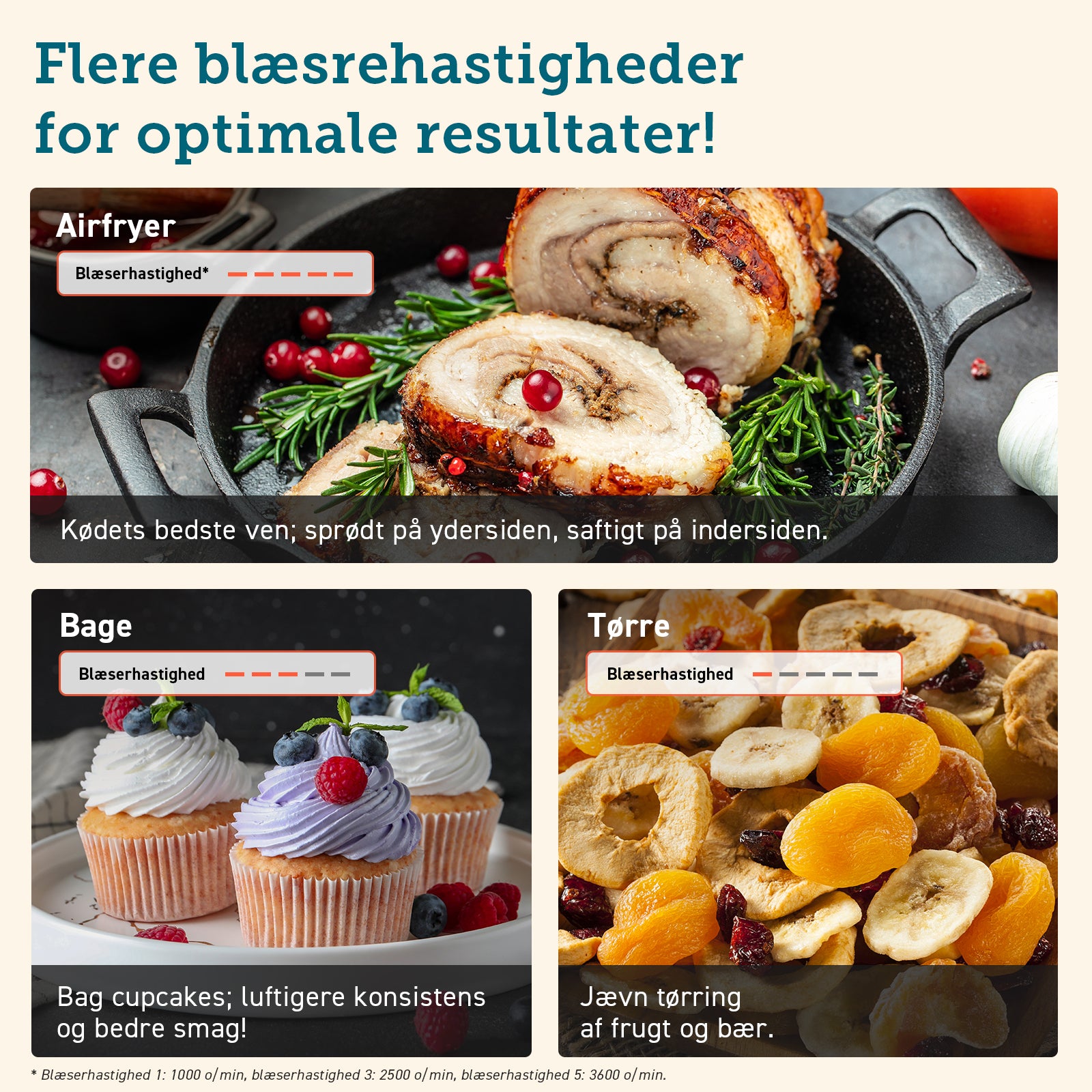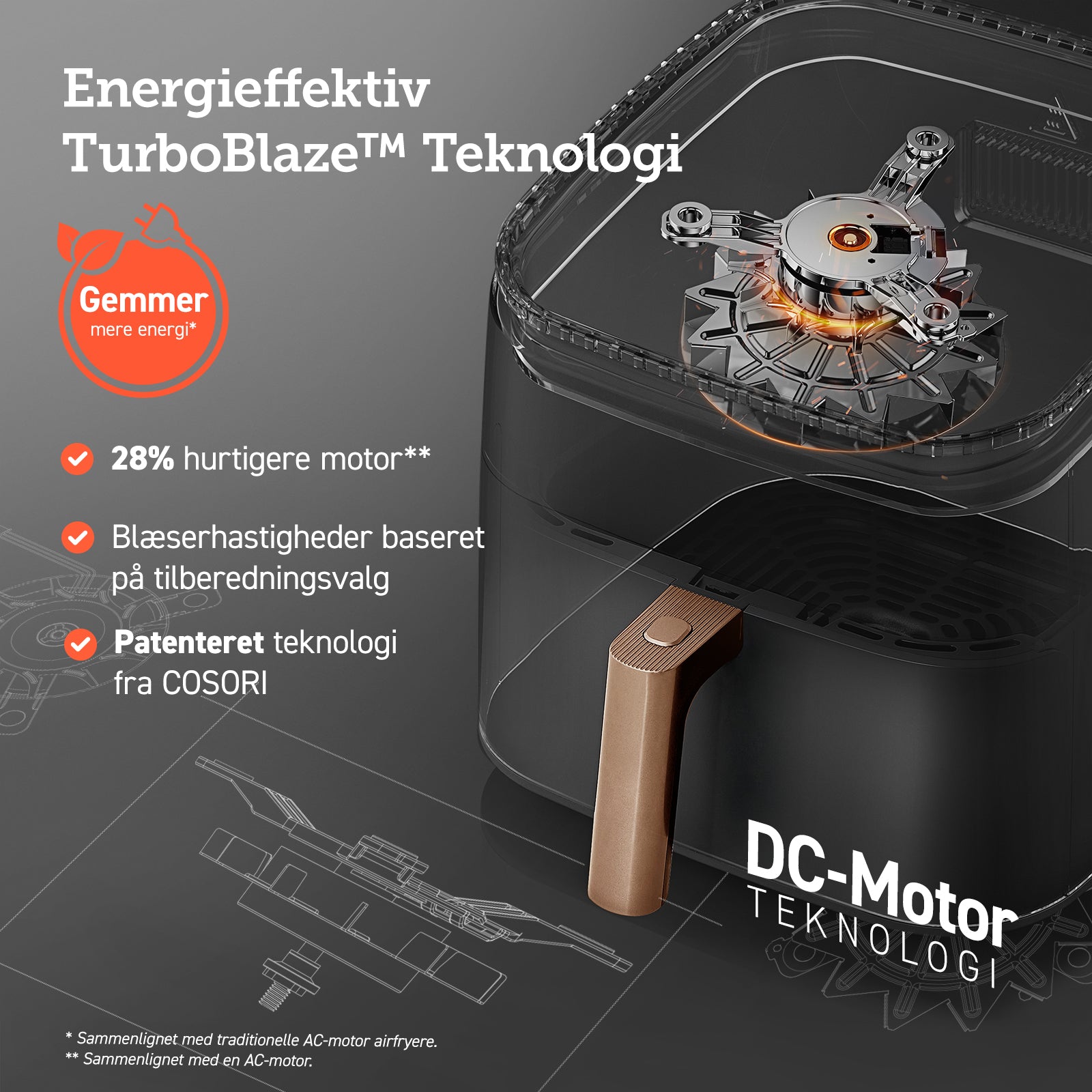Med en DC-motor, der øger blæserhastigheden til 3600 rpm, reduceres energiforbruget samtidig med, at madlavningen går hurtigere. For eksempel kræver 500 g pommes frites kun 0,2 kWh.