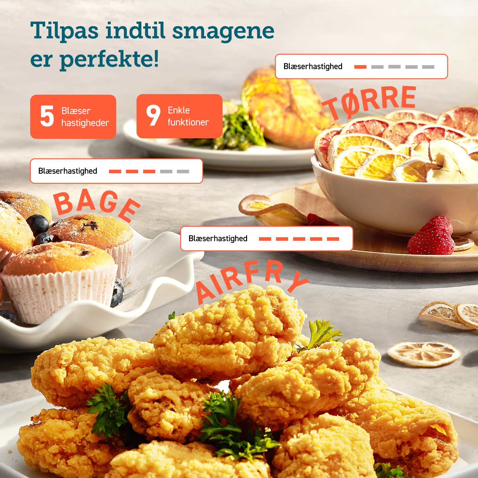 DC-motoren lader TurboBlaze automatisk operere med 5 blæserhastigheder fra 1000 til 3600 rpm, tilpasset de forskellige madlavningsindstillinger. Dette sikrer bedre luftcirkulation og mere jævn madlavning, samtidig med at den tilpasses dine personlige præferencer.